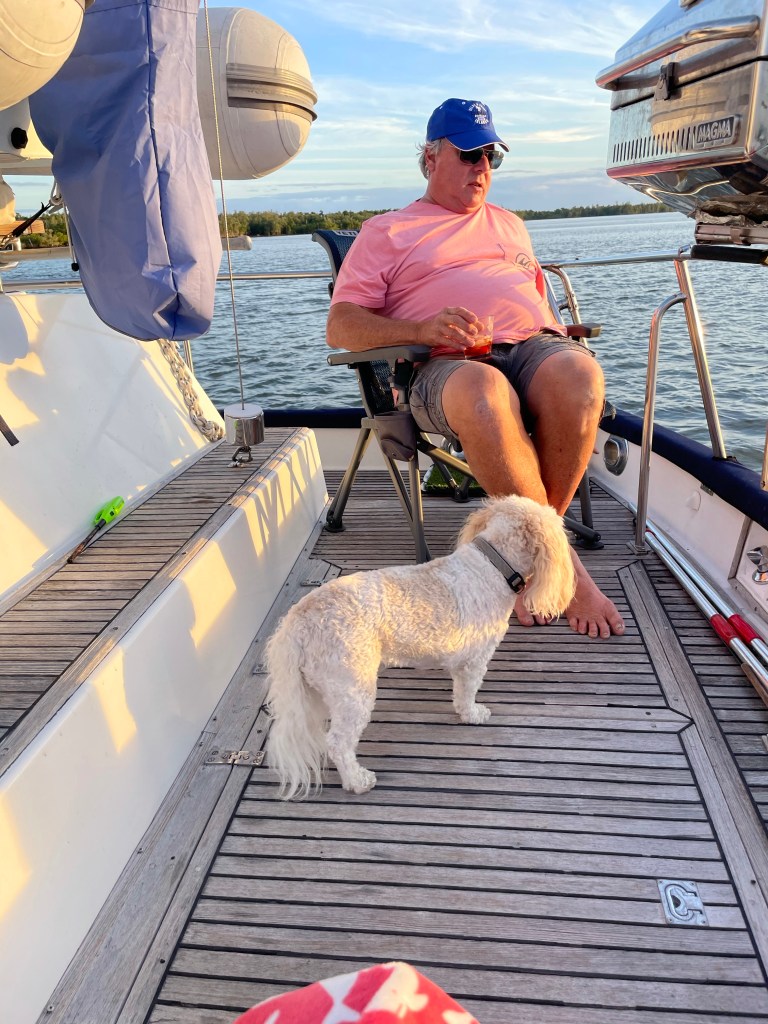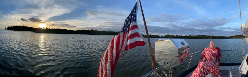 Richard is trying to repair the windlass that decided to quit working when we were lowering the anchor. Charlie and I are watching tv. We cooked hamburgers on the grill for dinner. Another quiet peaceful night at anchor!!