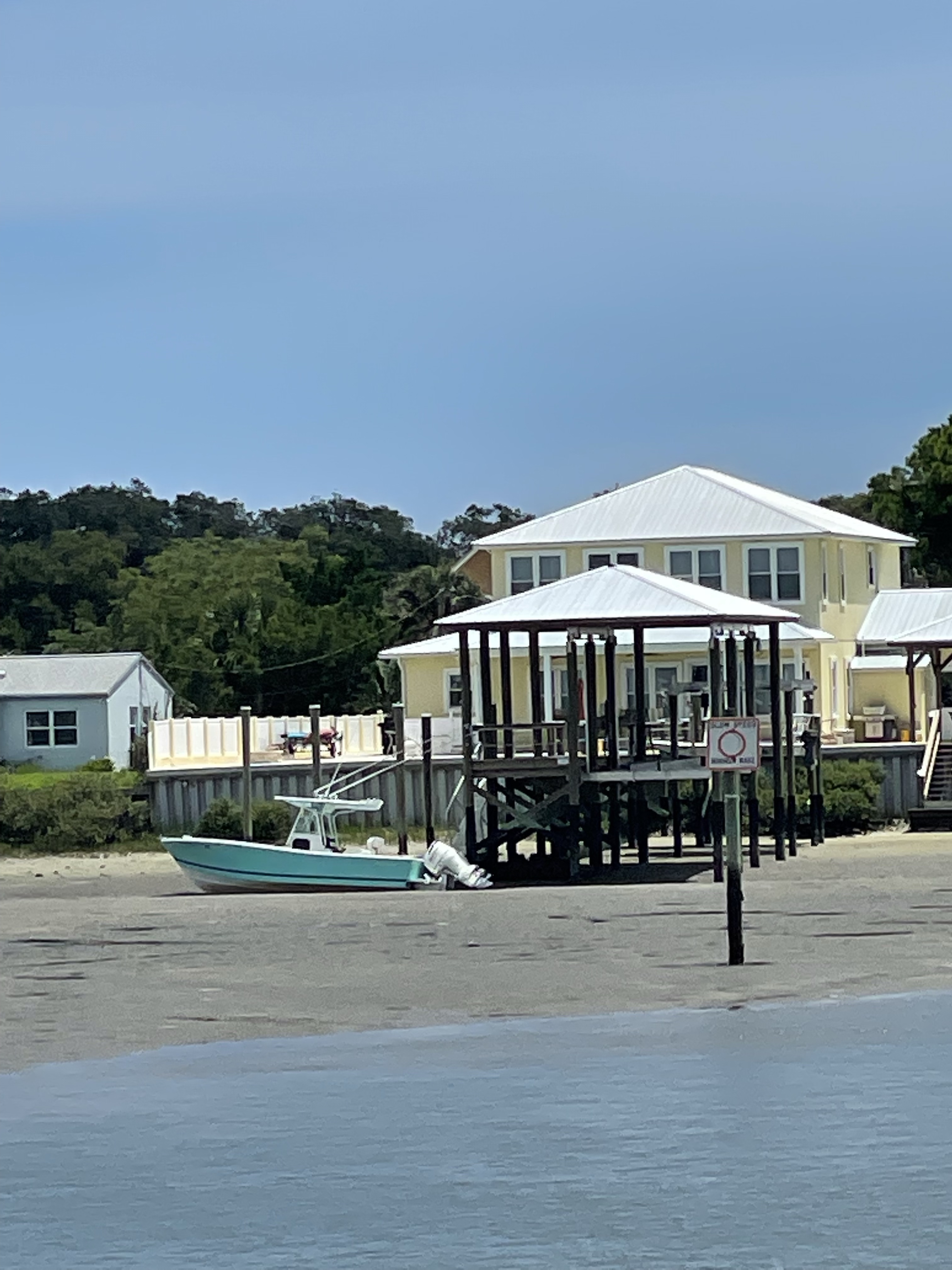 We are all tied up and had cocktails and snacks on the upper deck. We got dressed for dinner. We are going to King Fish Restaurant by dingy. Unfortunately our plans changed and we sent the guys for takeout because a big rain storm is coming!!!! I had shrimp and grits and it was good!!! Richard and Matt are all settled in to watch an Astros game and I went to bed!!! Good night!!!!