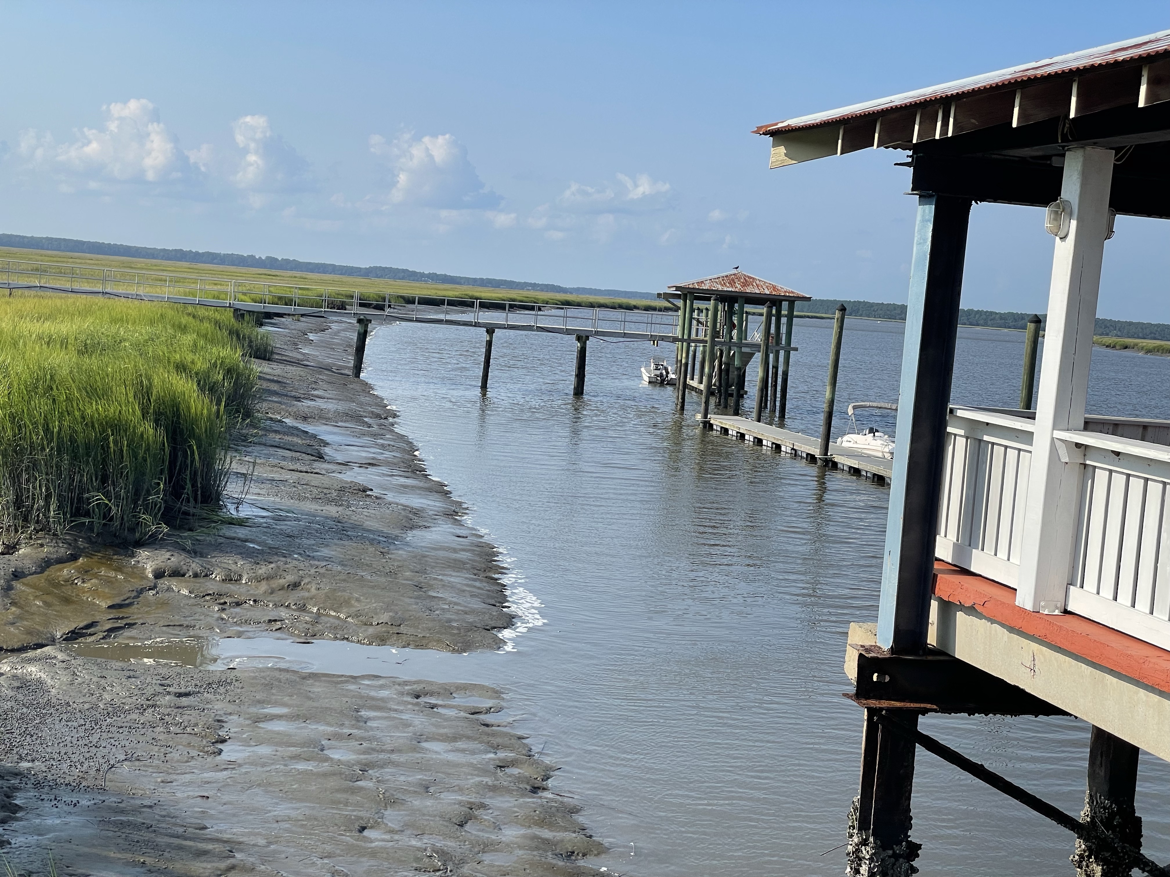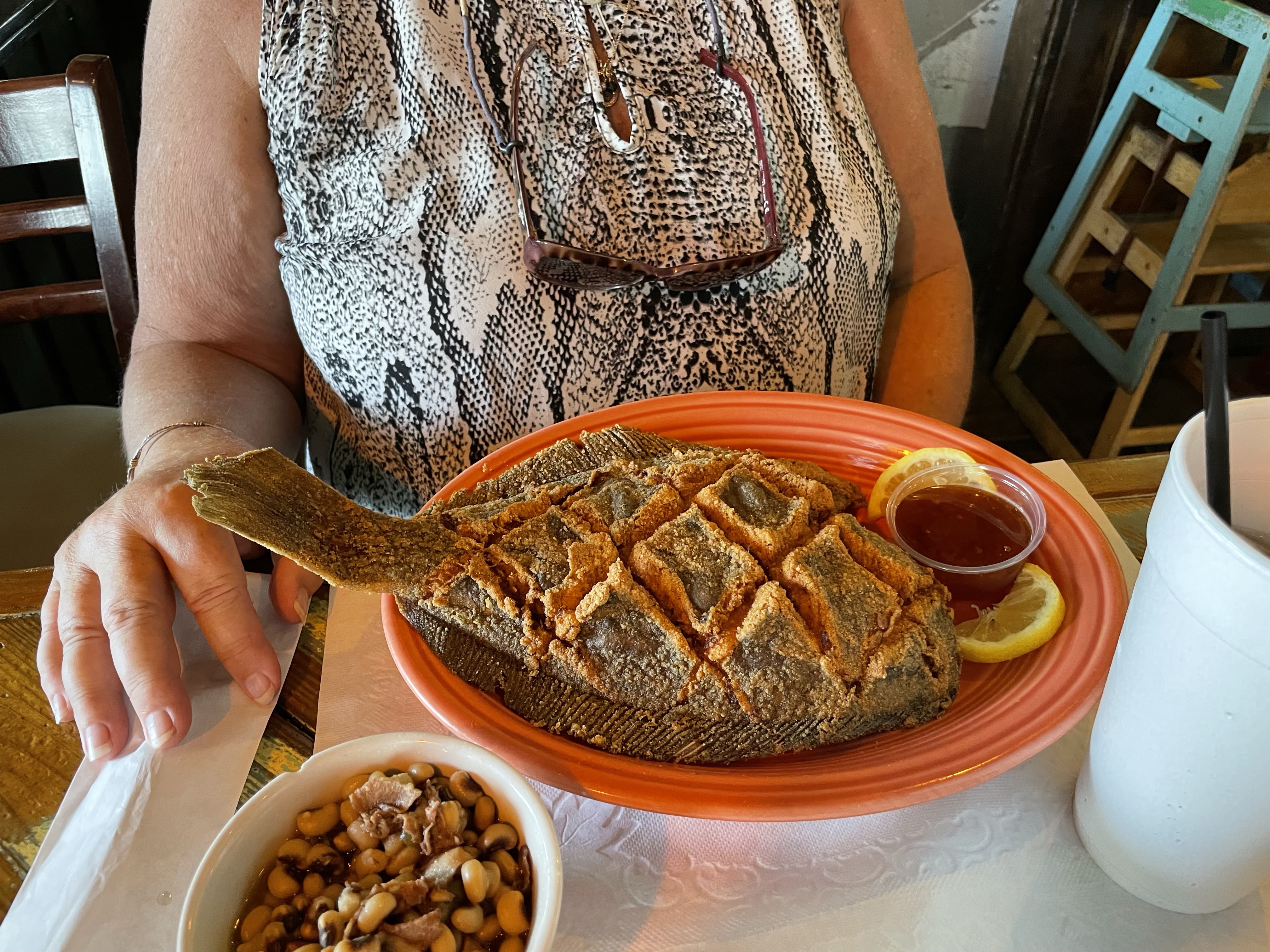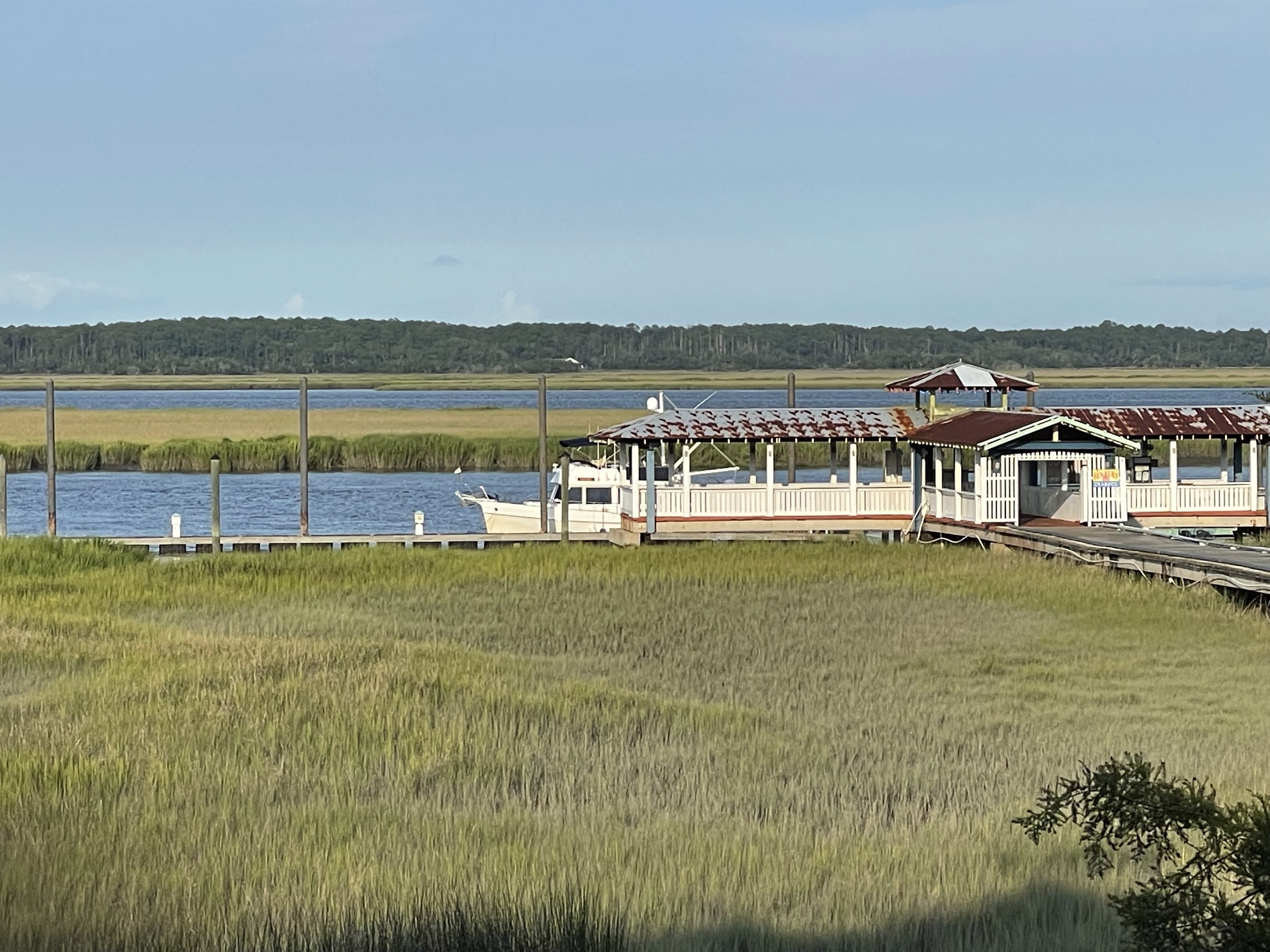 We arrived after a 67 mile ride at 3:00 pm to Sunbury Crab Co. This is a quaint little spot. We are the only large boat at the dock!!!! We went up for dinner at 6:00. The restaurant is so cute. It’s all open air with all the windows open to the outside and we sit at a tall table. We ordered our dinner and when it arrived it was beautiful!!! I had a lovely piece of flounder that had been fried beautifully!!!! It was delicious!!! I ate until I could eat no more!!! They had the best Georgia Sweet Tea, I drank so much I ODed on the sugar!!
