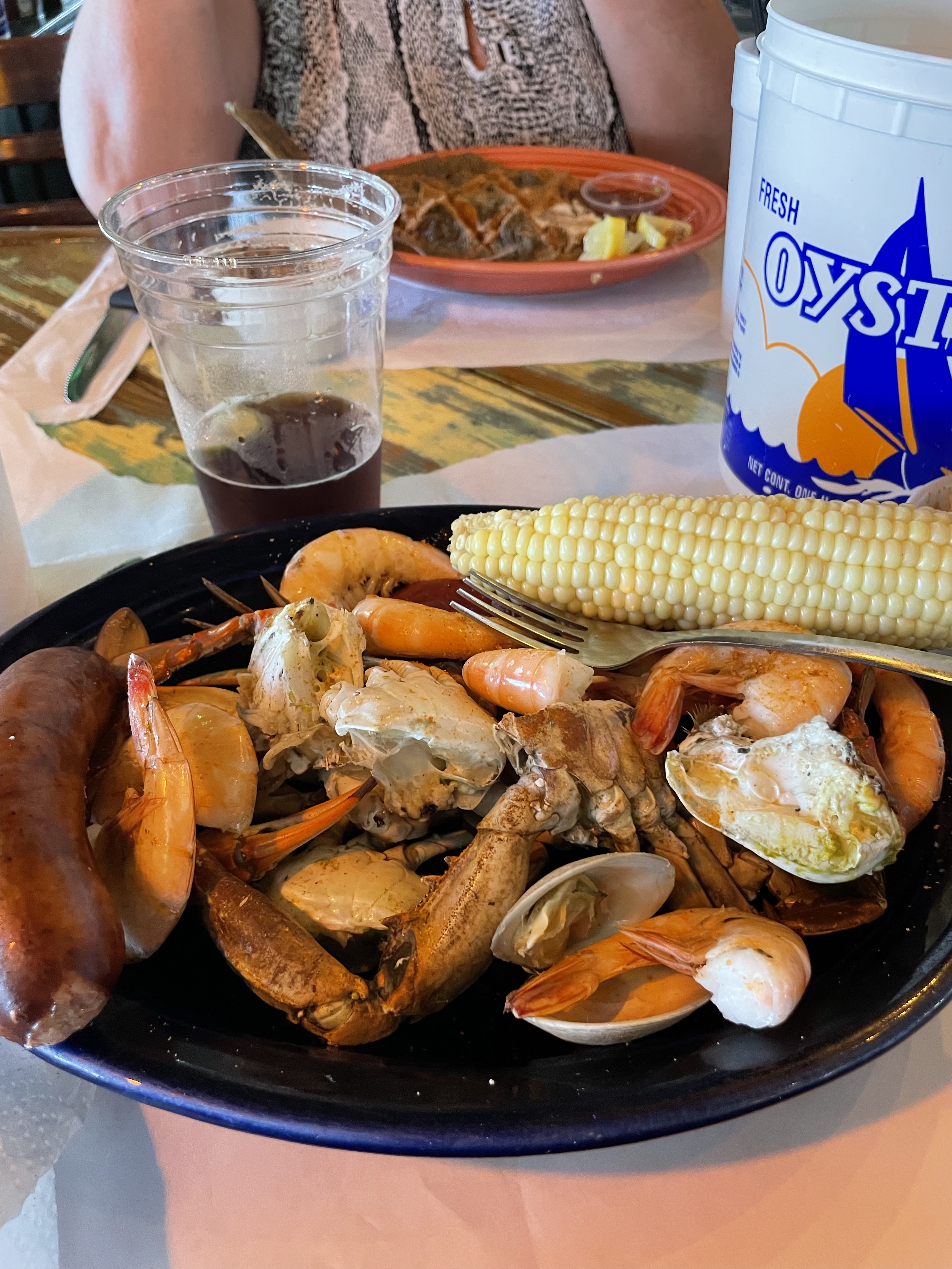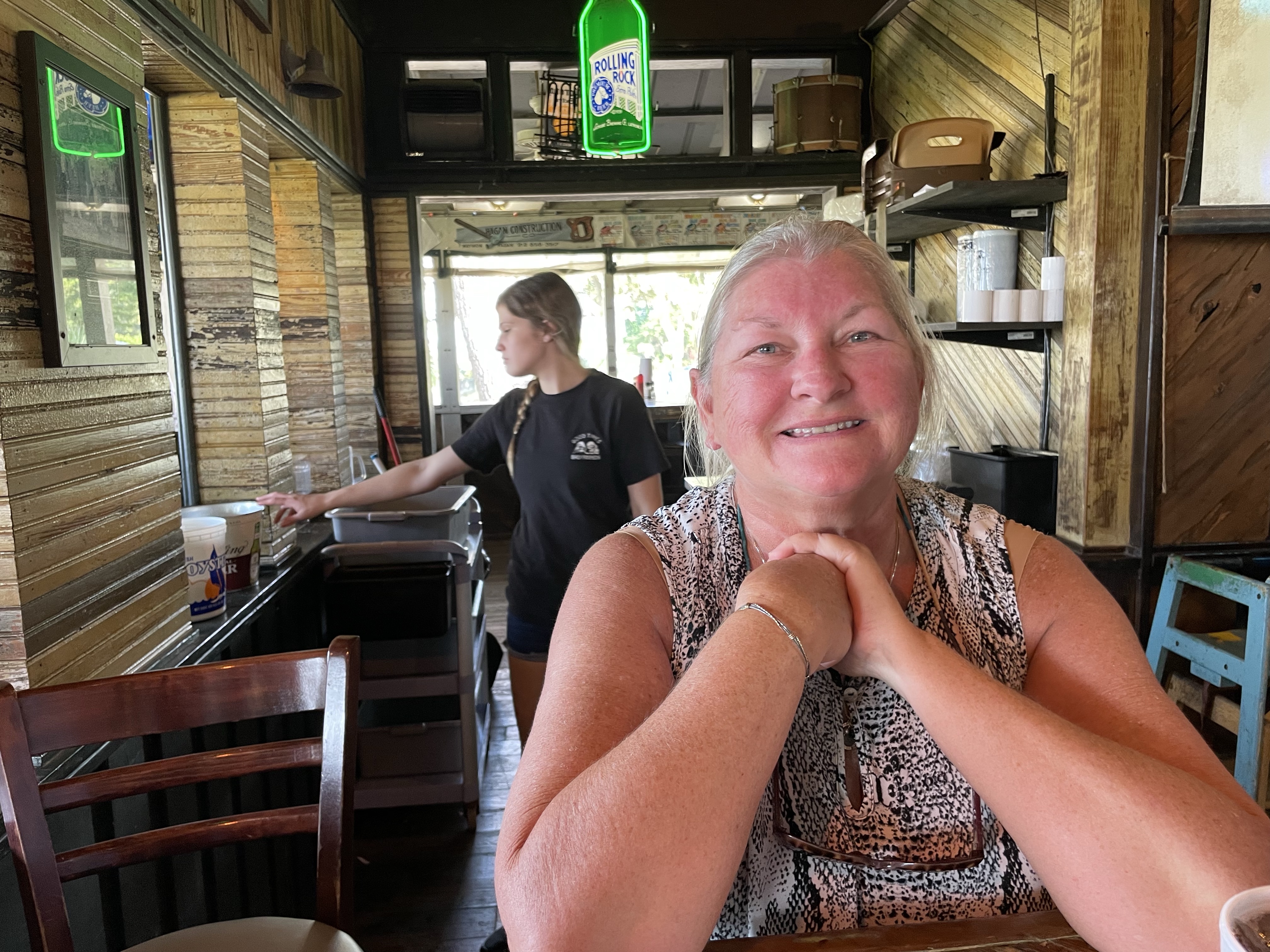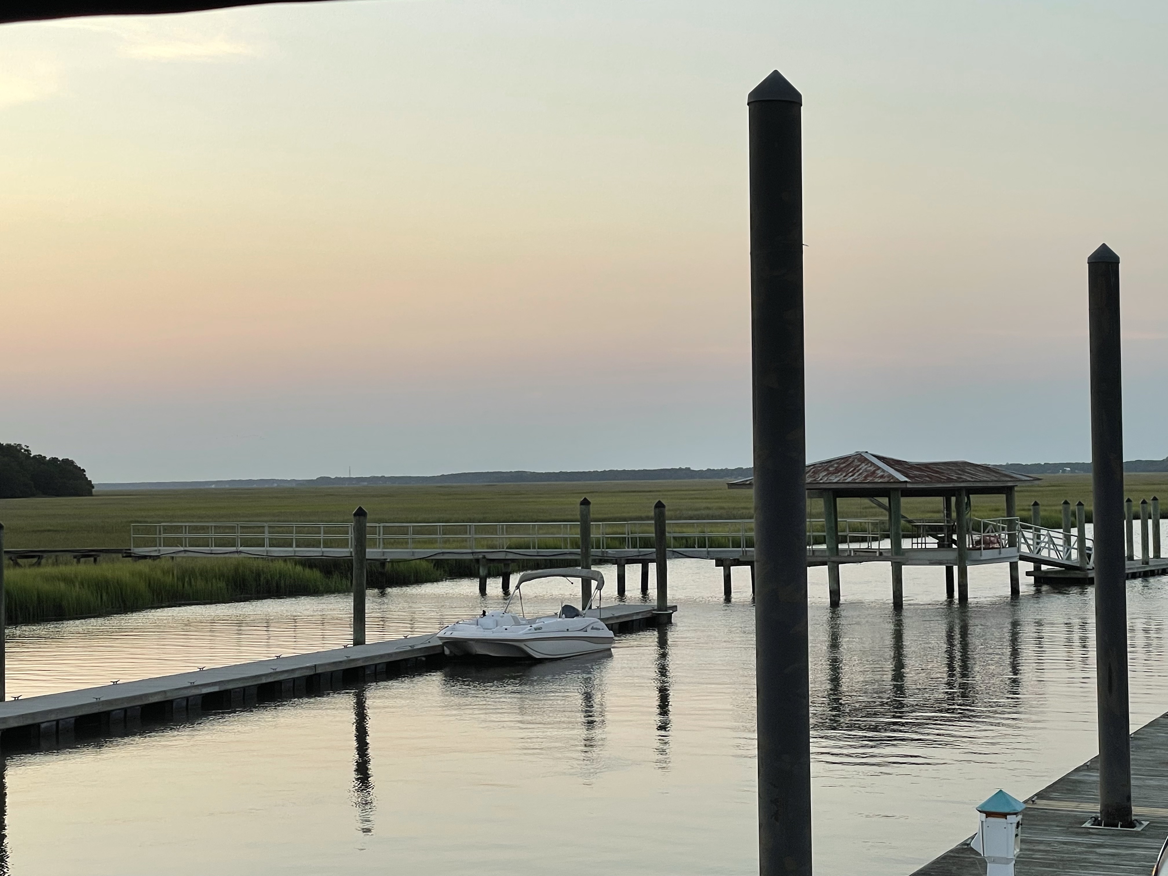We arrived after a 67 mile ride at 3:00 pm to Sunbury Crab Co. This is a quaint little spot. We are the only large boat at the dock!!!! We went up for dinner at 6:00. The restaurant is so cute. It’s all open air with all the windows open to the outside and we sit at a tall table. We ordered our dinner and when it arrived it was beautiful!!! I had a lovely piece of flounder that had been fried beautifully!!!! It was delicious!!! I ate until I could eat no more!!! They had the best Georgia Sweet Tea, I drank so much I ODed on the sugar!!