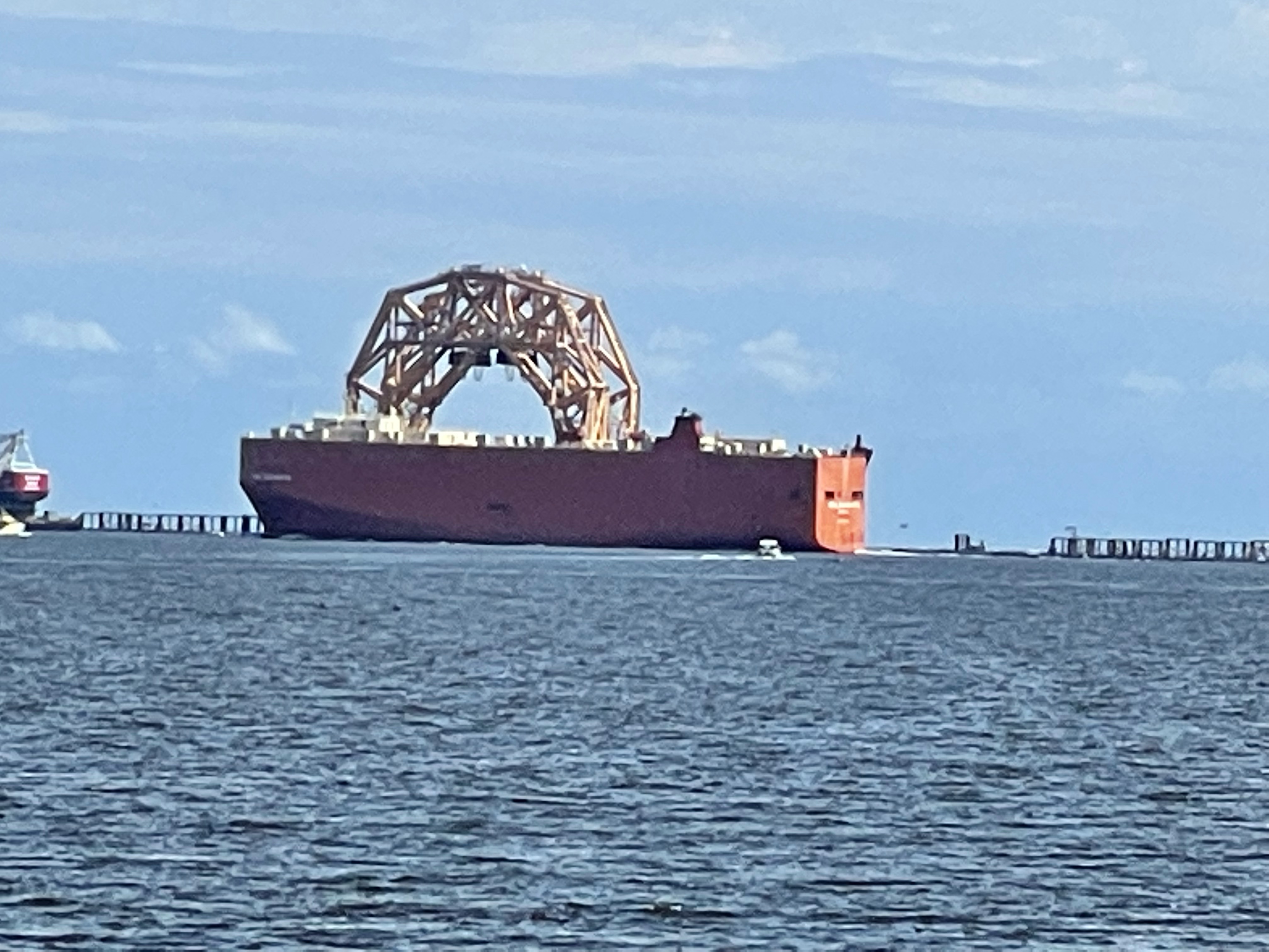 Car carrier passing out to sea in front of the gantry that is removing the remains of a sunken ca carrier from 2019.