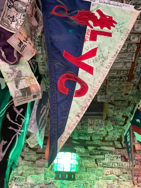 It’s another day in paradise in the Bahamas!!! Not a lot going on today. I’m still in my jammies at 2:30!!! For dinner tonight we have reservations because it is steak night!!! Always a popular night!!! They will have one of our favorites with Kevin and Brendel from the old Gully Roosters band playing in the courtyard. We went up for drinks at the bar before dinner and found an old burgee from Lakewood Yacht Club in Kemah. One of our first boating buddies, Gary Romer, is now the Commodore at LYC.