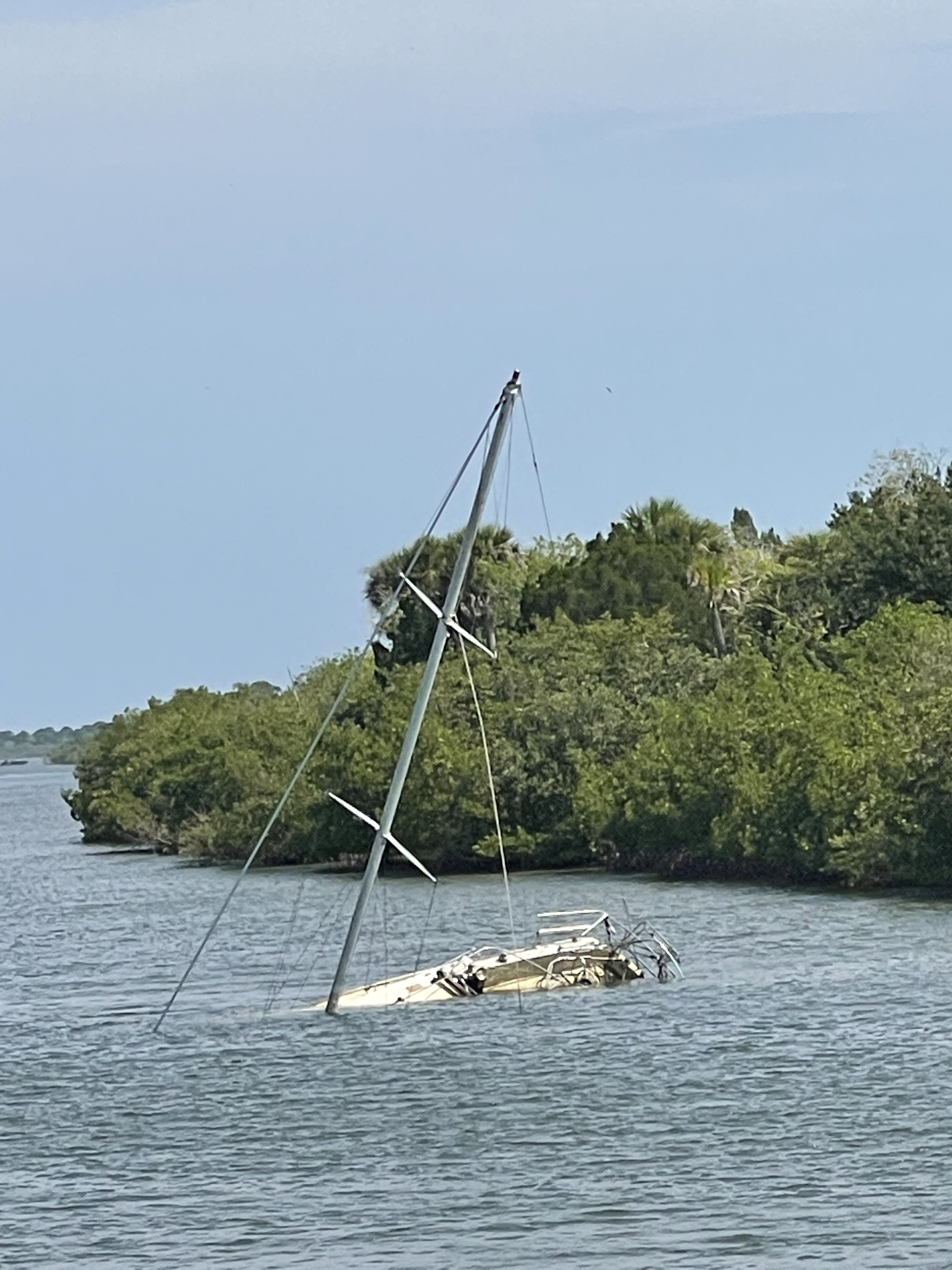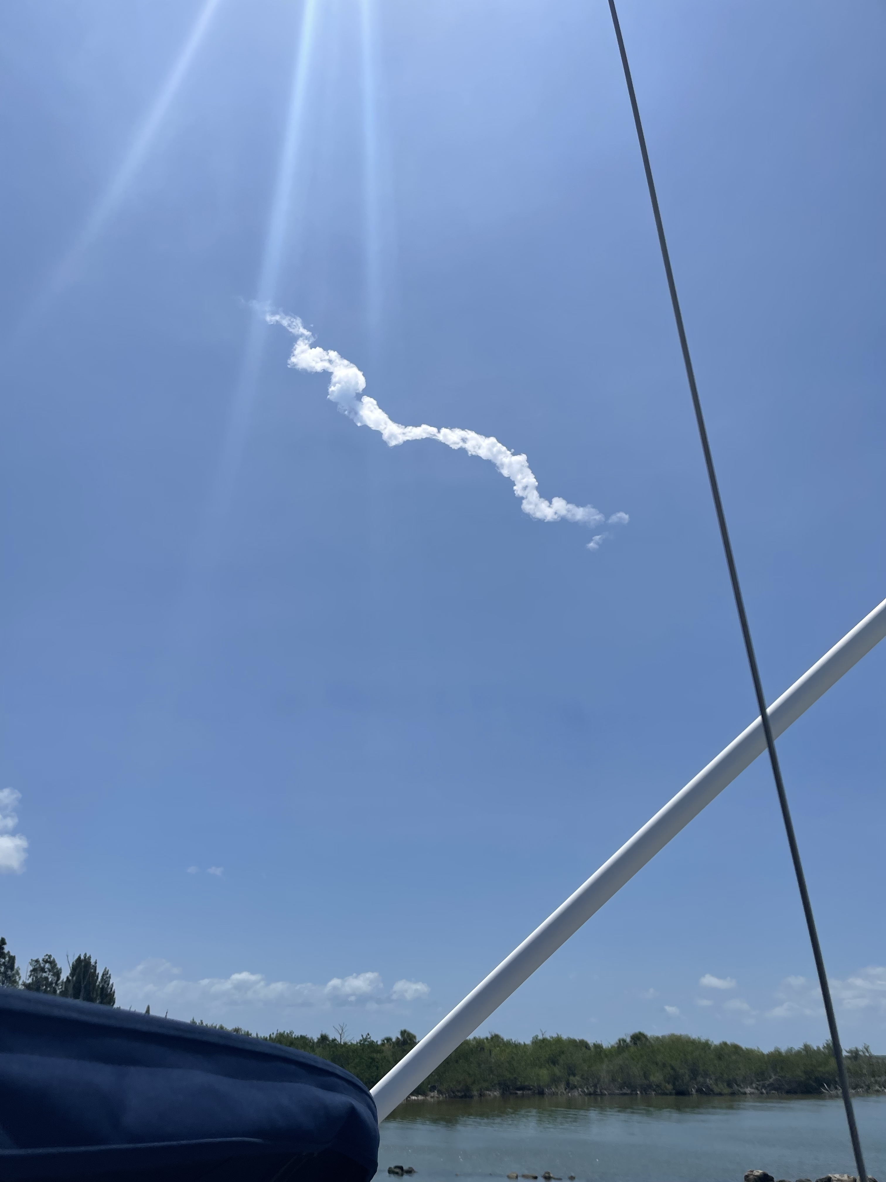 We left early this morning at 7:00am!!! We are going to New Smyrna Beach. We had a nice surprise near Cape Canaveral during our trip. We heard a strange loud roar overhead and it turned out to be the SpaceX rocket launch. We couldn’t see the rocket but did get pictures of the contrail. We docked in at 3:30. Kinda of a long day!!! We had sausage for dinner. And I was soon off to bed!!! Another awesome day on the water!!!!