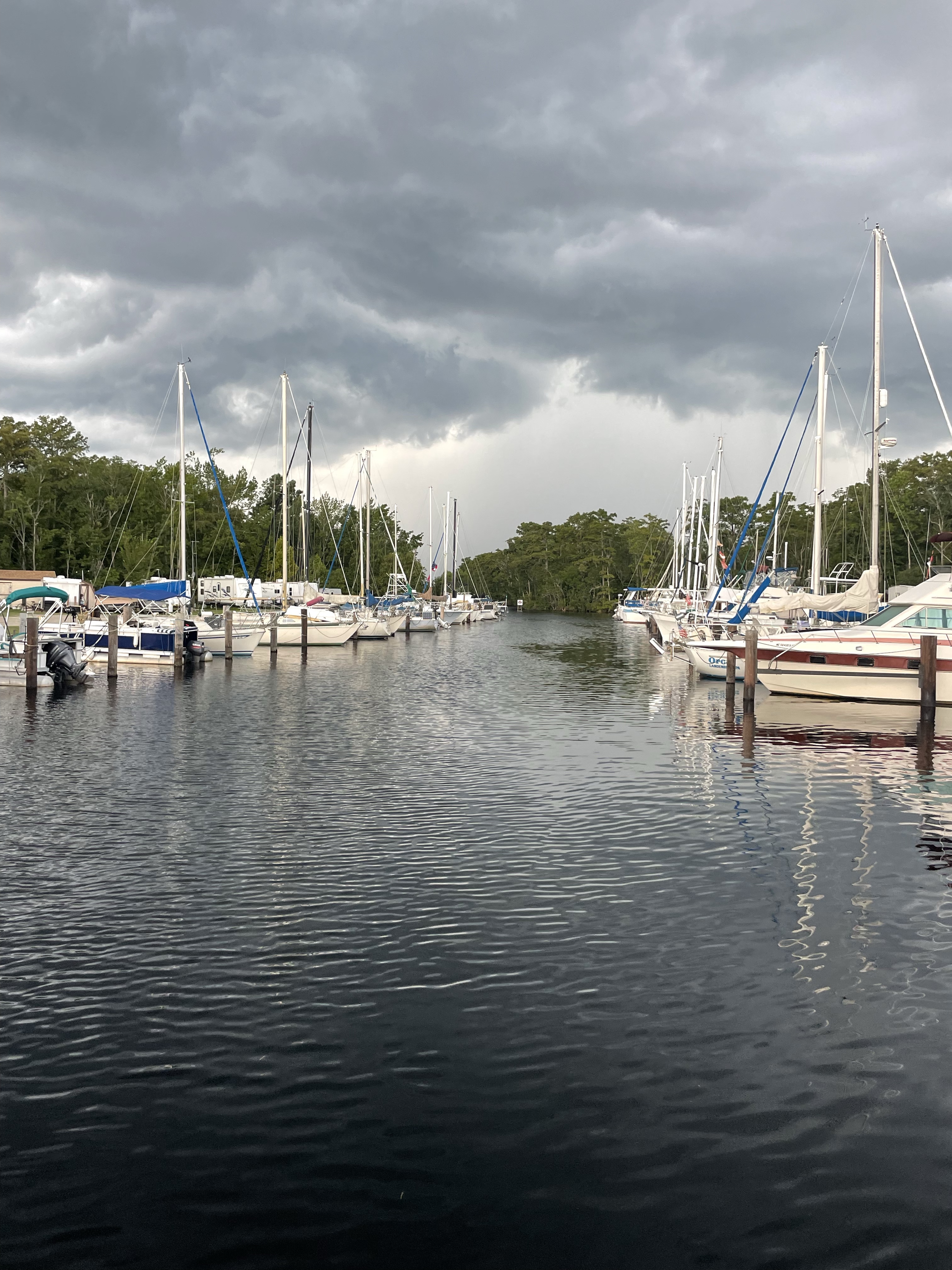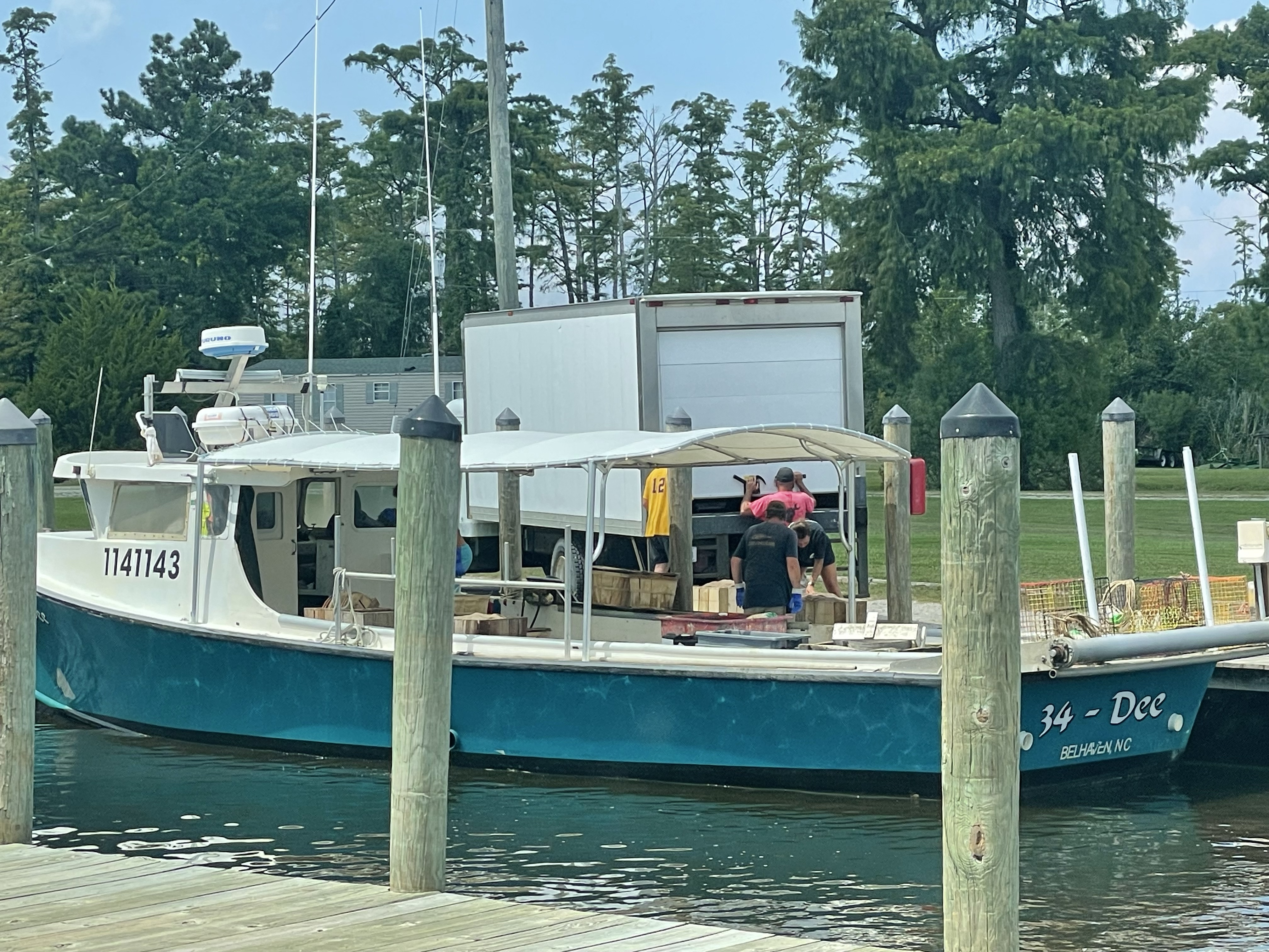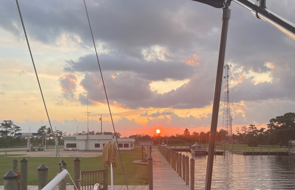 This morning we left Belhaven and headed to Alligator River Marina. It was a very pleasant ride. We got to Alligator River at 2:00 pm. There is literally nothing here!!!! The “marina” is a gas station with a little kitchen serving sandwiches. We ate a hamburger for lunch that was good!!! We are tied up to a wall behind the gas station. We watched 2 crab boats come in and unload their catch to a truck that pulled up to the dock. What a great place!!! We watched the Astros and went to bed.