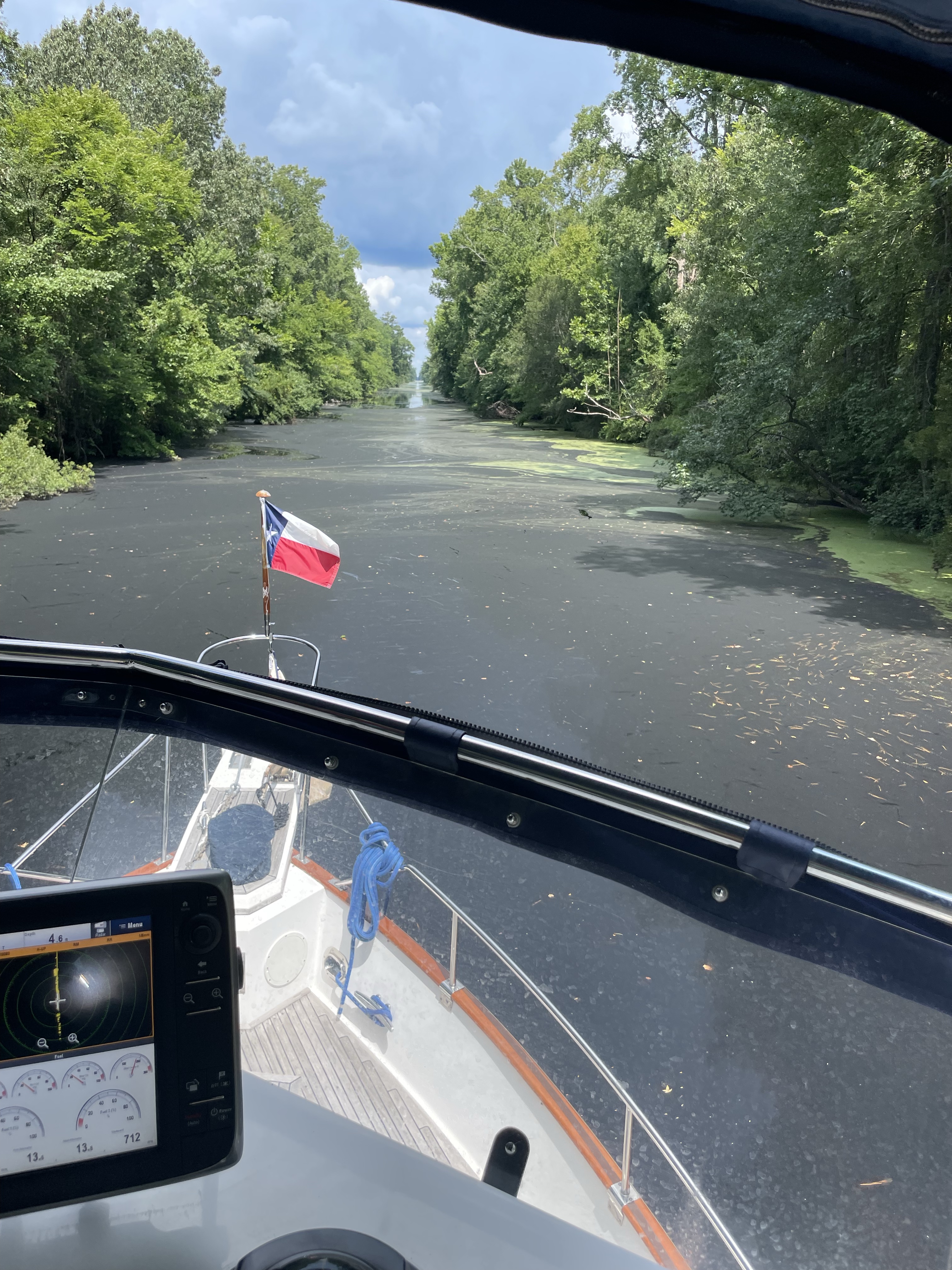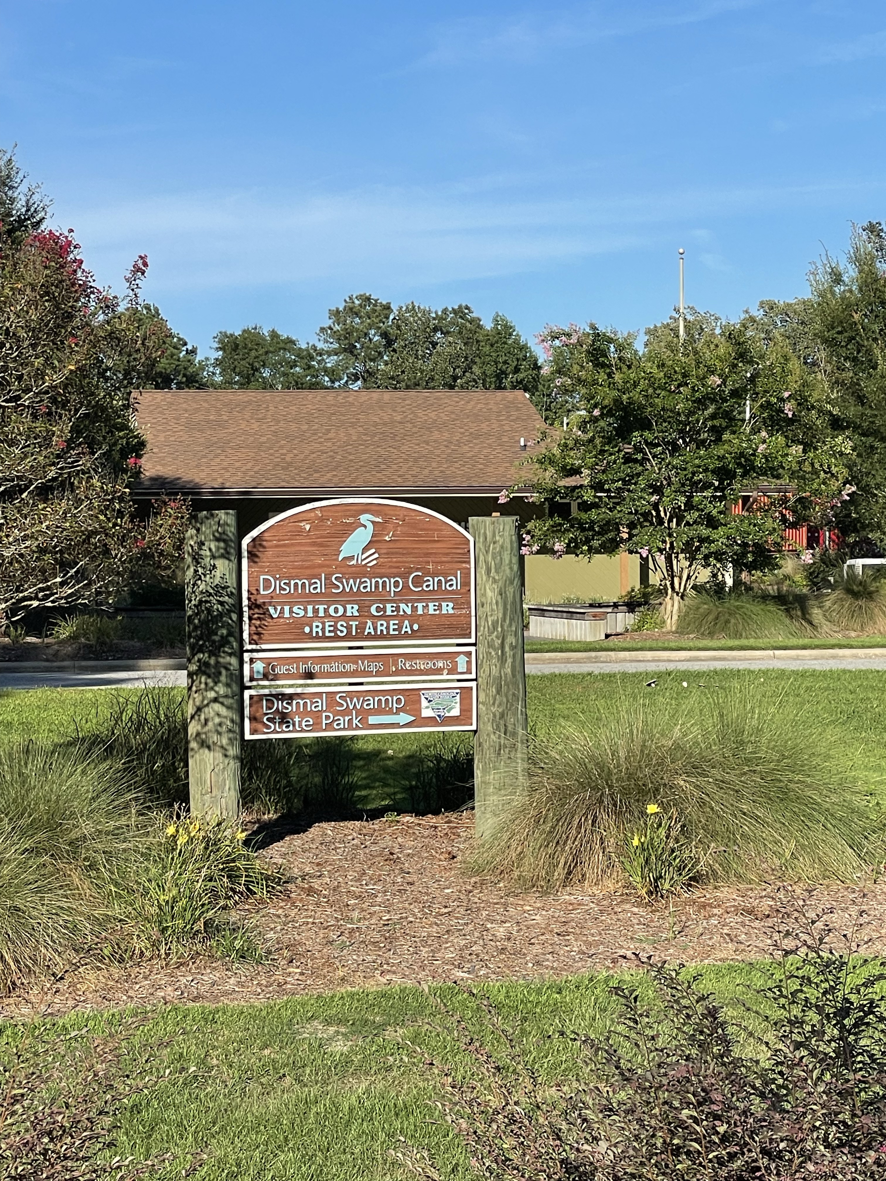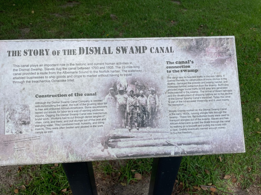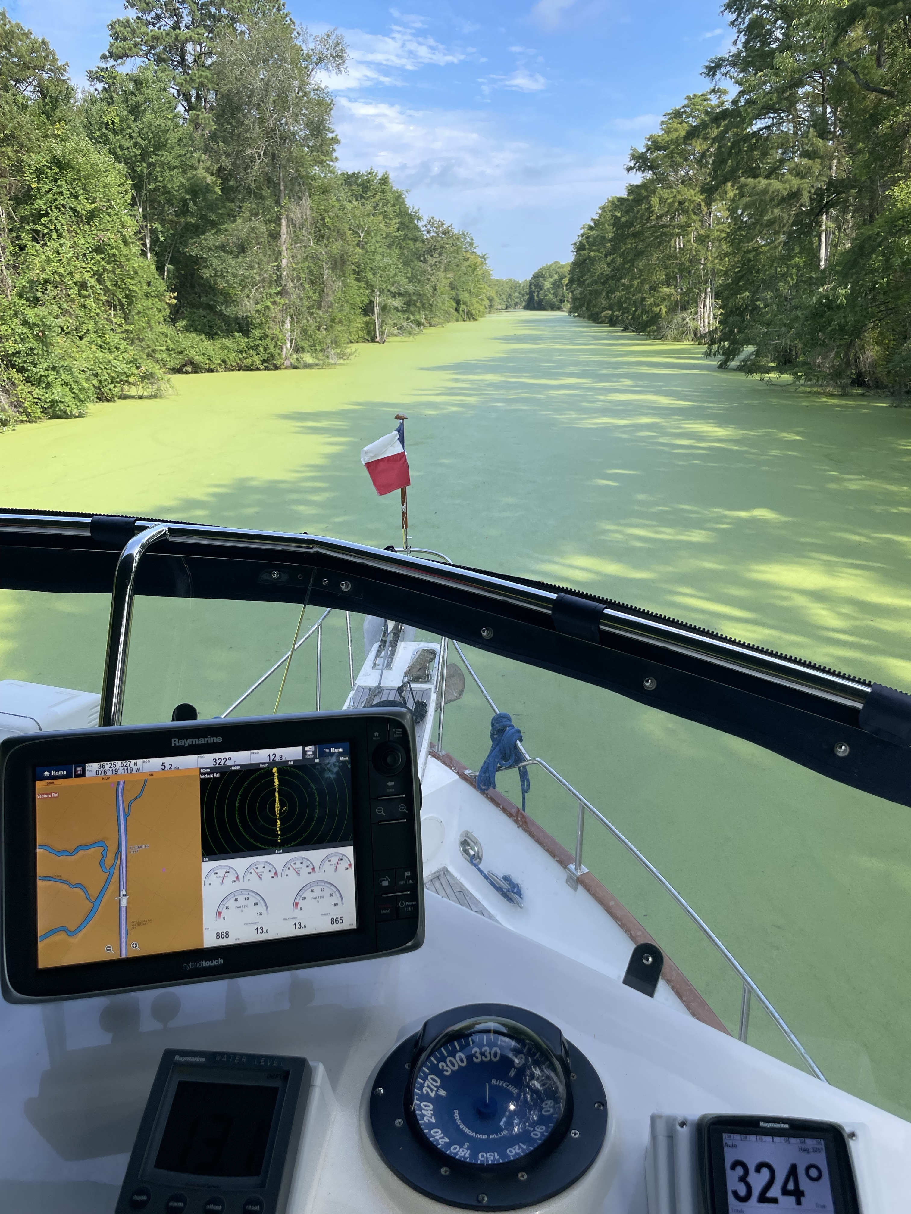 His morning we were up early and left before 8:00am. We are going to the Dismal Swamp and need to be there by 11:00 to catch the lift lock. We motored along in very pleasant conditions as the waterway is very curvy and scenic. As we entered the Dismal Swamp Canal there were huge amounts of duckweed in the water. The water was completely covered in it!!! This is a very scenic waterway and everything is so pretty. We never saw another boat. We made it to the visitors center and tied up to the wall. We will stay here for the night.