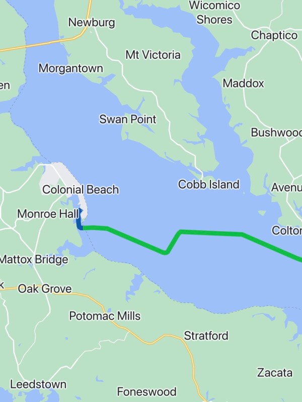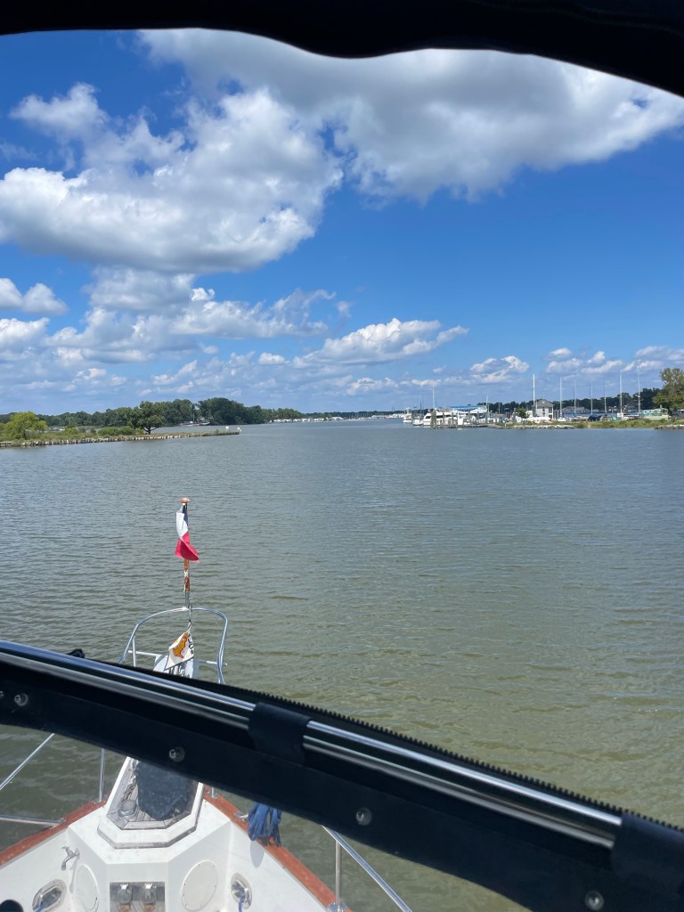 We left Ridge at 9:00 am and arrived at Colonial Beach, VA at 1:30 pm. We had to zig zag our way to the marina because we were called by the Range Patrol Boat. Turns out we were crossing the firing range during a “hot” drill. This means the military is doing artillery procedures in the area. So we quickly moved out of their way. But we never saw anything!!!
