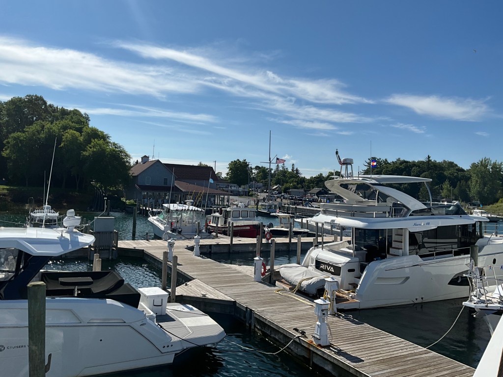 It is an easy cruising day in wide open water with no waves!!! I can see how this water could be really rough at times!!! But not today — it’s smooth sailing for us!!! We arrived in Leland and got tied up in our slip. It was a good day.