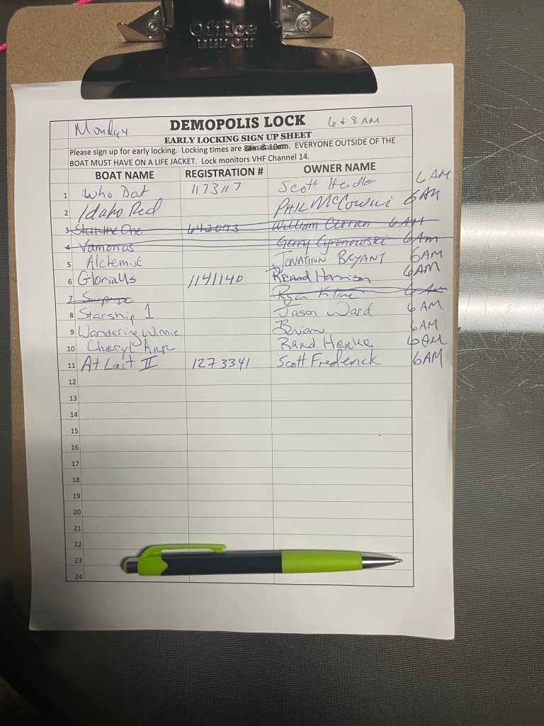 We went from Demopolis to Okatuppa Creek anchorage—a big day 93 miles!!!! We have a lock right off the bat here – Demopolis Lock. This is our next to the last lock for the Great Loop!!!!