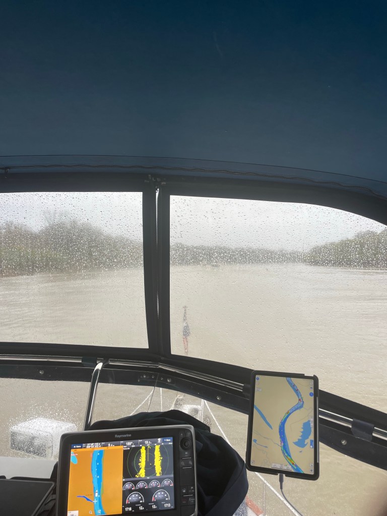 We went thru our last lock today!!!!! Yippee!!!! We are going to another anchorage – Tensas river anchorage. It’s a rainy day with a lot of debris in the water from last nights rain. We both have to keep a sharp lookout so we don’t run over something that could damage the boat.