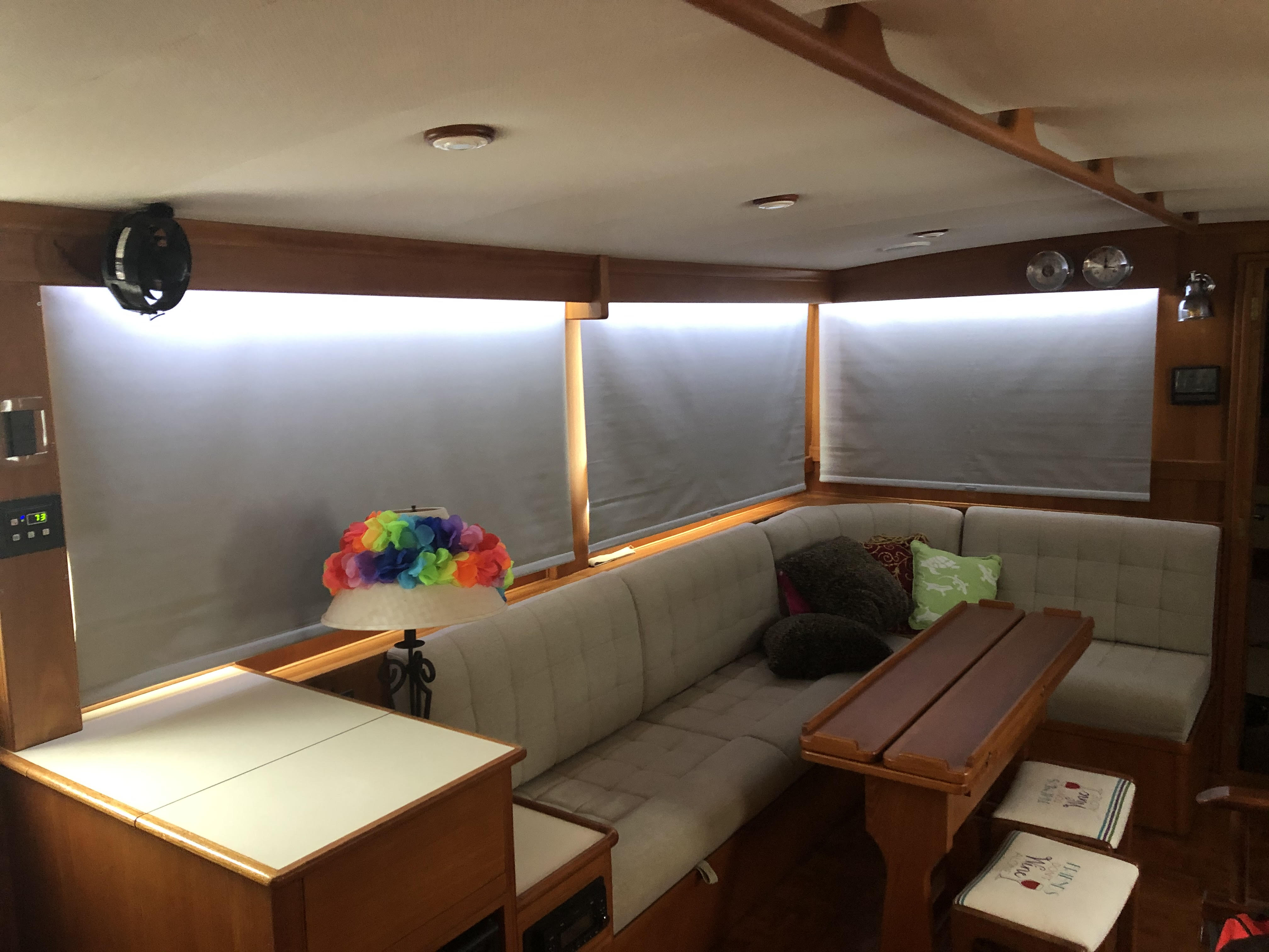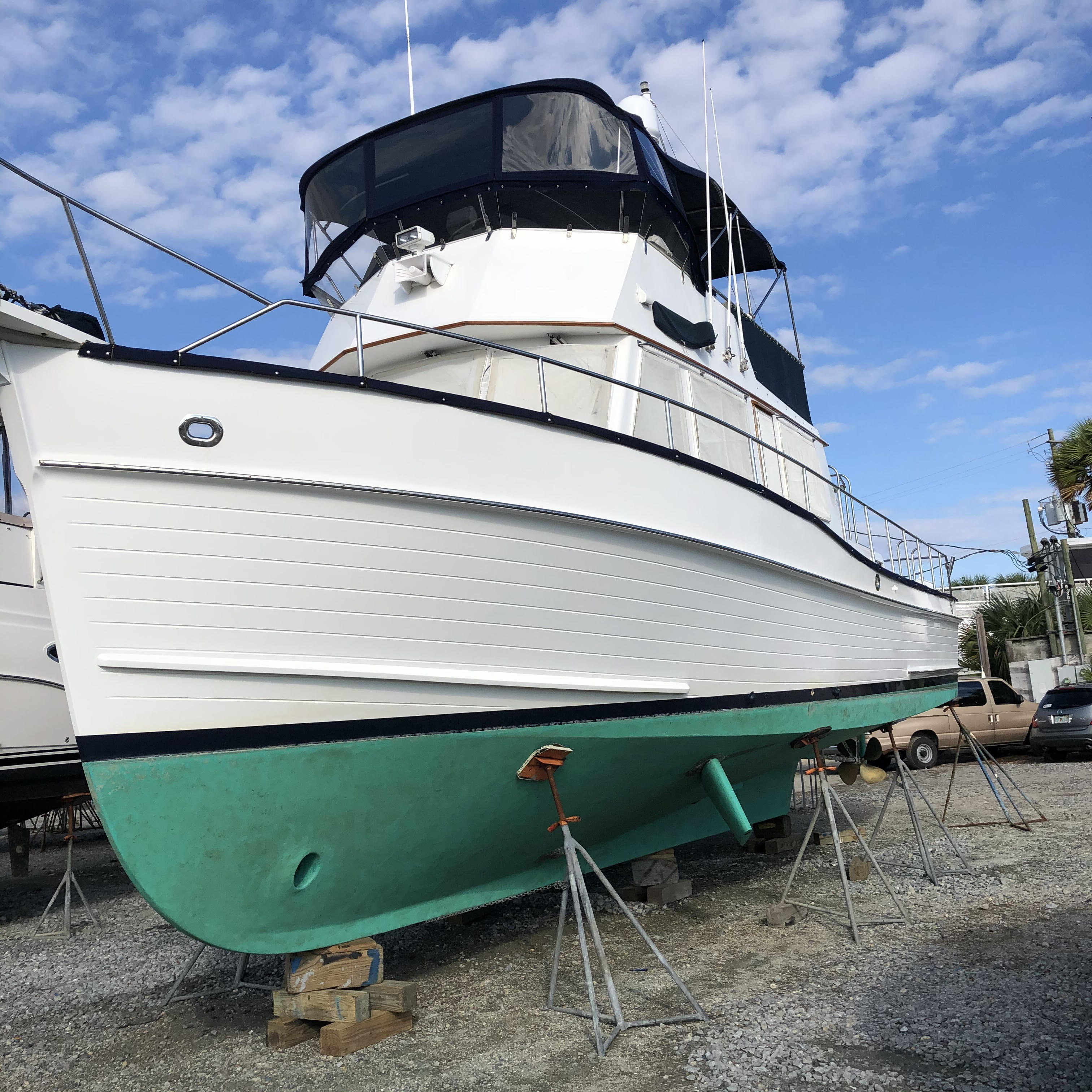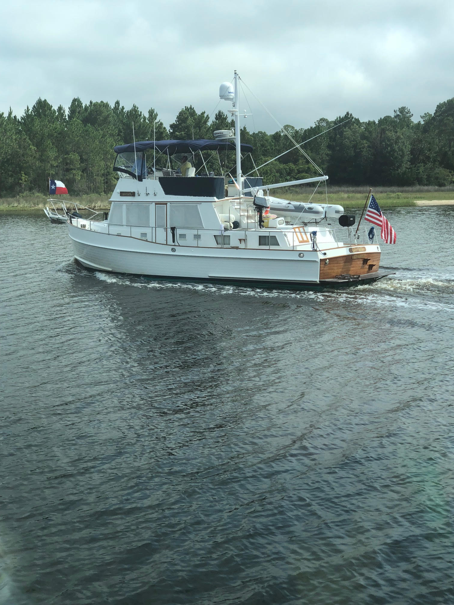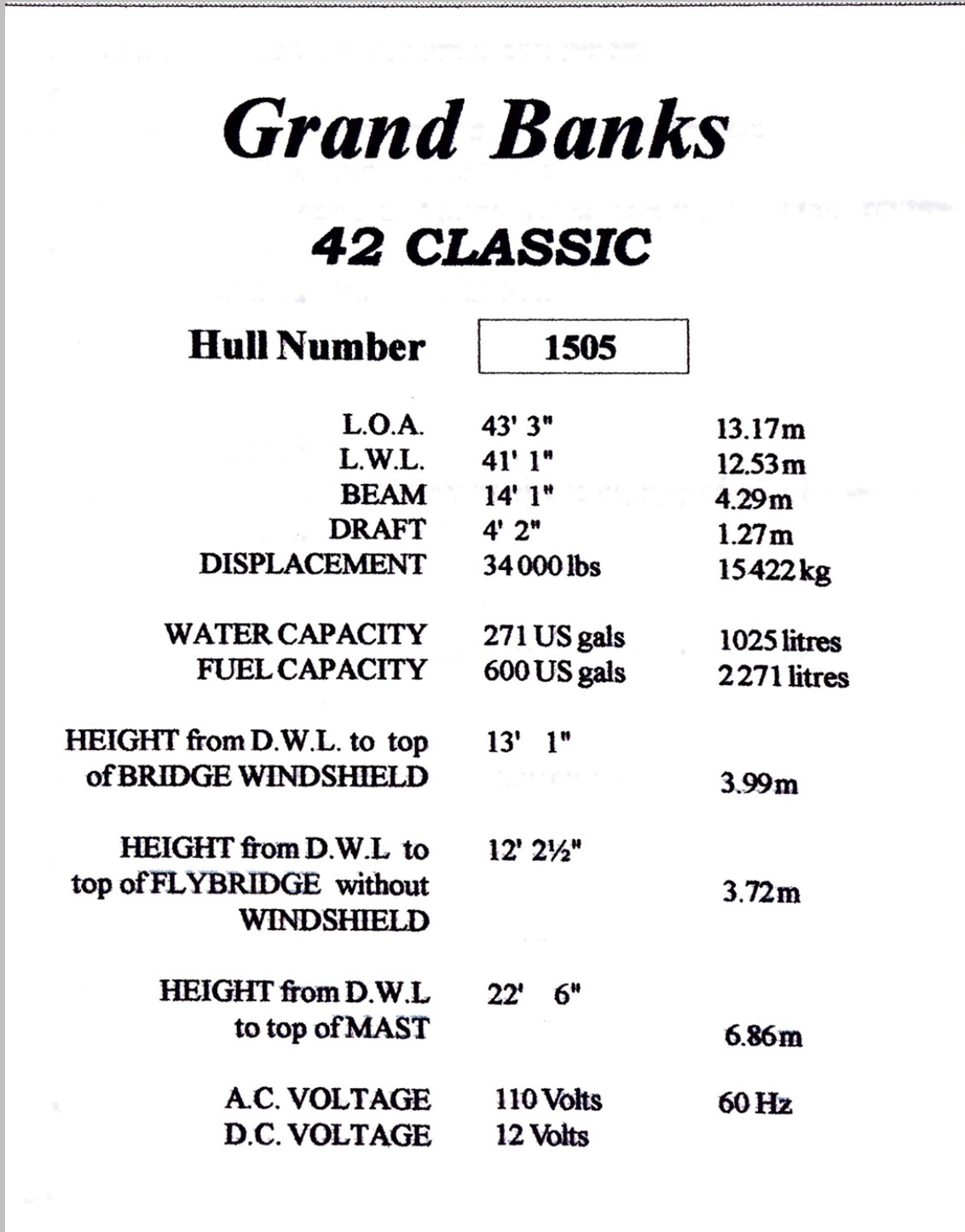 GloriaUs is a 2002 Grand Banks 42 Classic with NAID stabilizers, bow thruster, and updated Raymarine electronics at the upper and lower helm. She is powered by twin Caterpillar 3126B diesel engines each generating 420hp. There are two side entry doors into the salon, both port and starboard. The salon has a large L-settee to starboard and a straight settee across to port. Forward is the lower helm area to starboard and galley opposite to port. The aft master stateroom has an island queen berth with private en suite head and sink, and separate shower stall. The forward quest stateroom offers a V-berth with a private en suite head.